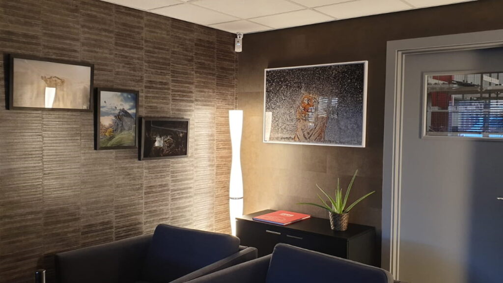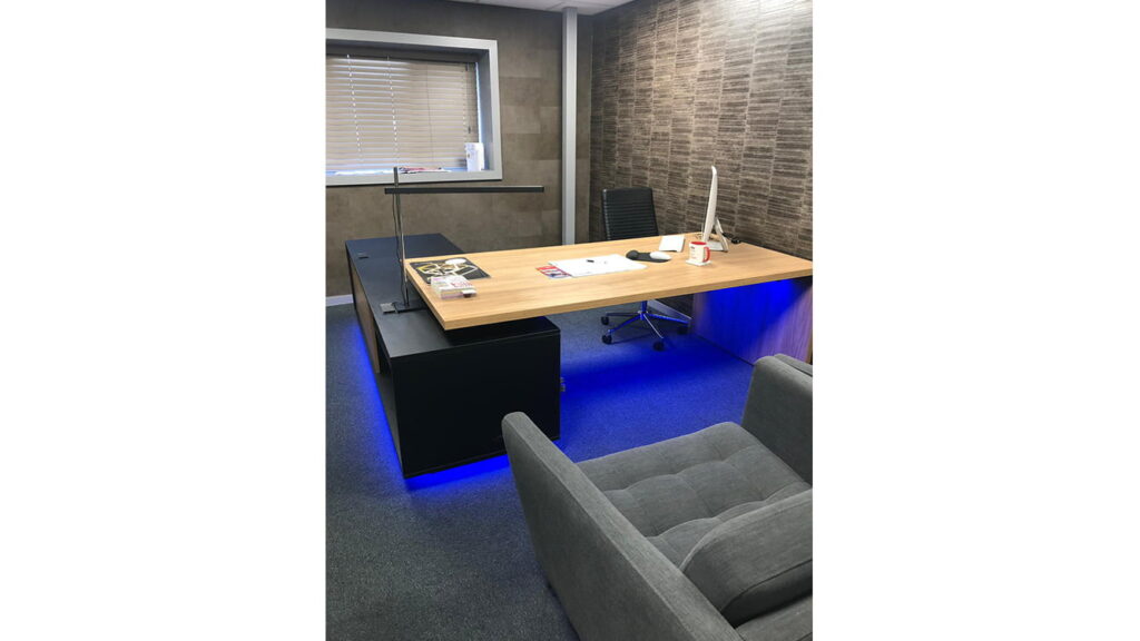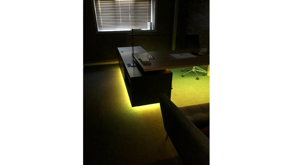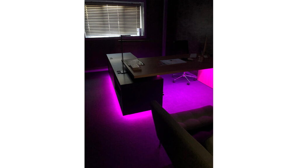 Here we brought a well-designed small office to life with the use of a table LED lighting solution. We also brought under control the lamp light and the industrial ceiling lights with the use of plug in voice activated technology and Alexa.